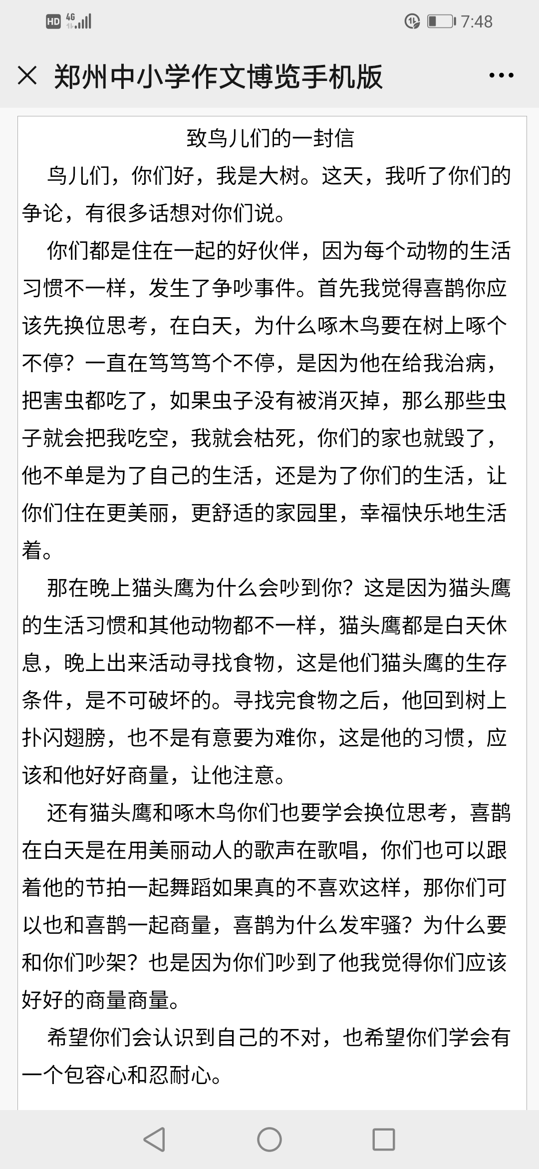 致鸟儿们的一封信 热439 类别:原创 发表时间:2020-10-11 19:55 已有 440 次阅读 指导老师:刘景焕 所属学校:新密市金凤路小学