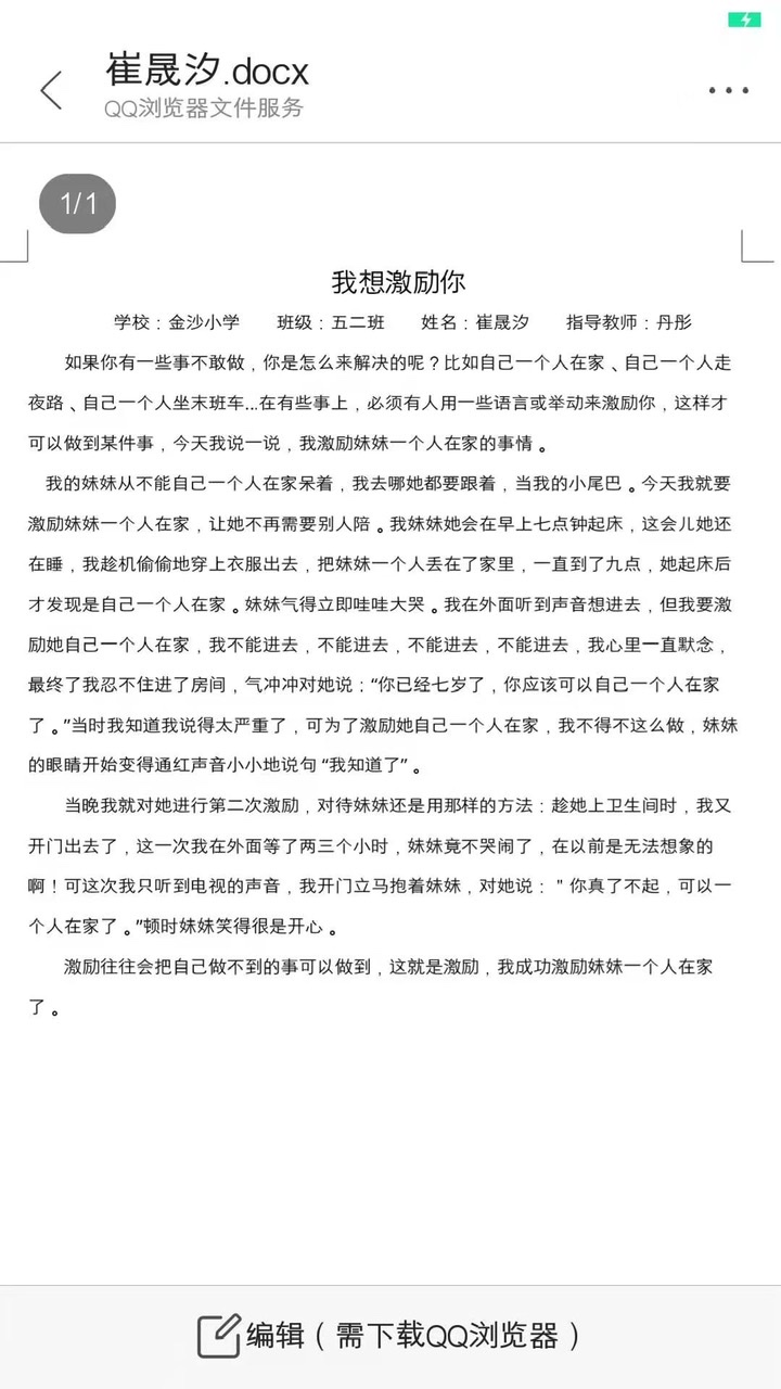 我想激励你 热334 类别:记叙 发表时间:2020-10-12 17:50 已有 335 次阅读 指导老师:丹彤 所属学校:金水区金沙小学