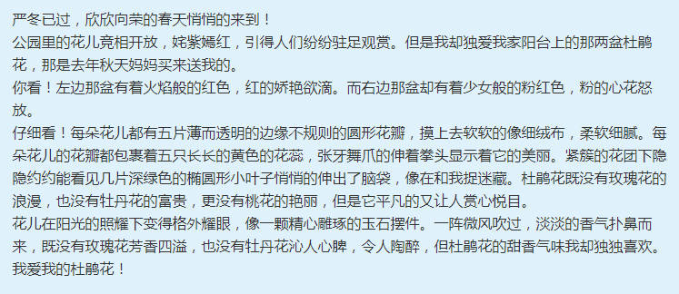 美丽的杜鹃花 热1166 类别:状物 发表时间:2021-07-26 11:20 已有 1167 次阅读 指导老师:李艳莉 所属学校:金水区文化绿城小学