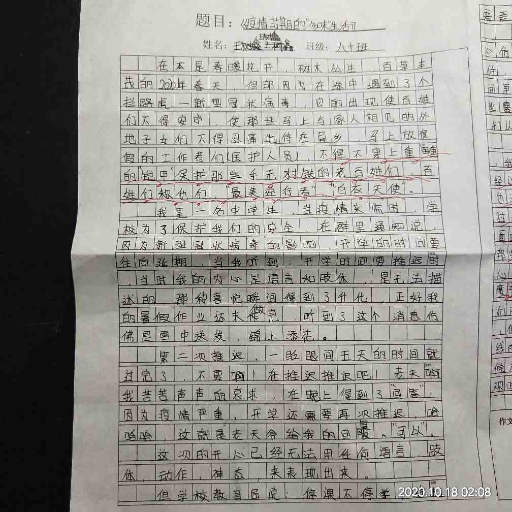 “疫情”时期的“多味”生活 热318 类别:记叙 发表时间:2020-10-18 02:12 已有 319 次阅读 指导老师:赵丽平 所属学校:新密市市直一初中