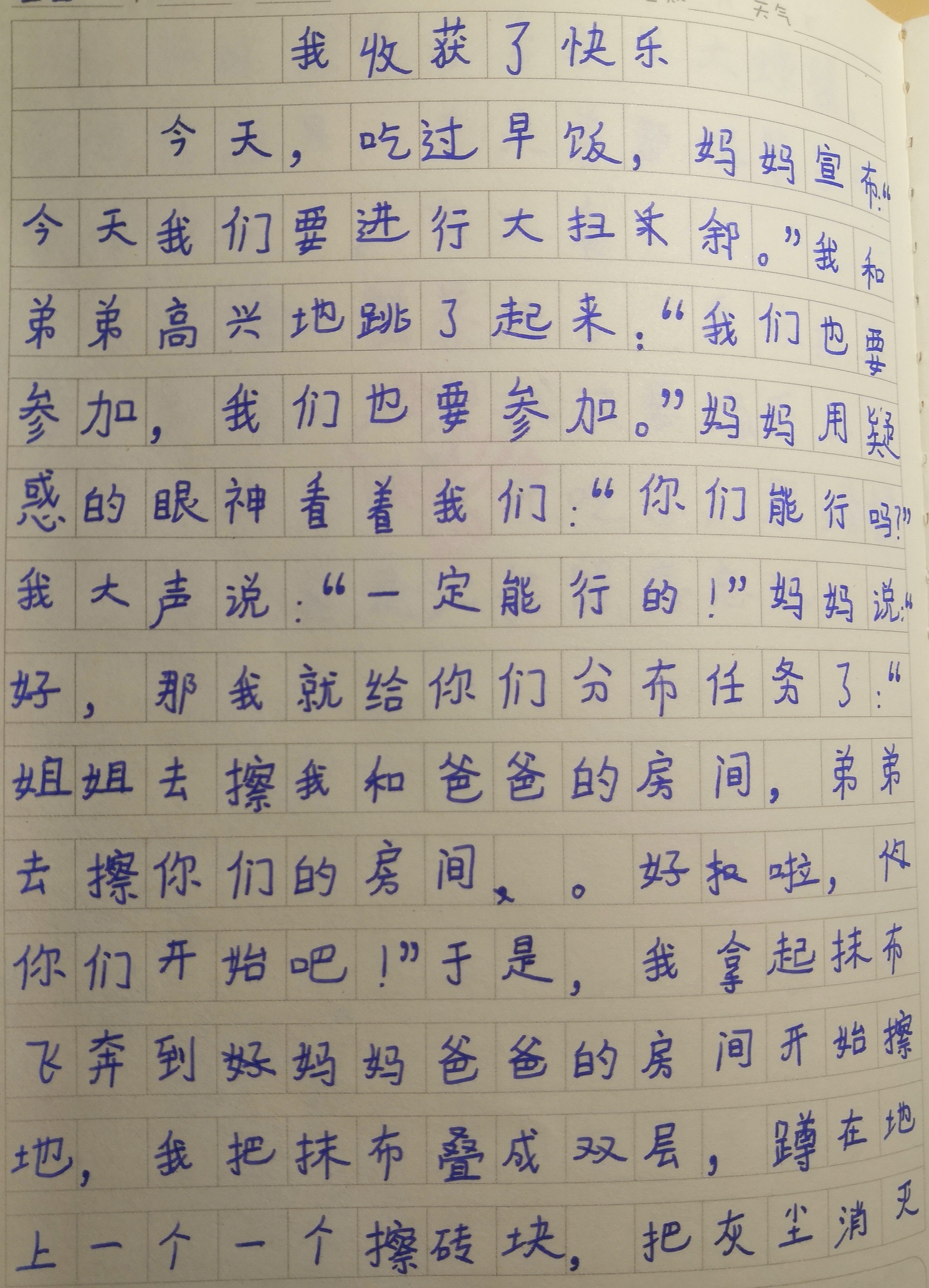 我收获了快乐 热440 类别:记叙 发表时间:2020-10-18 20:33 已有 441 次阅读 指导老师:柳昊涵 所属学校:金水区文化绿城小学