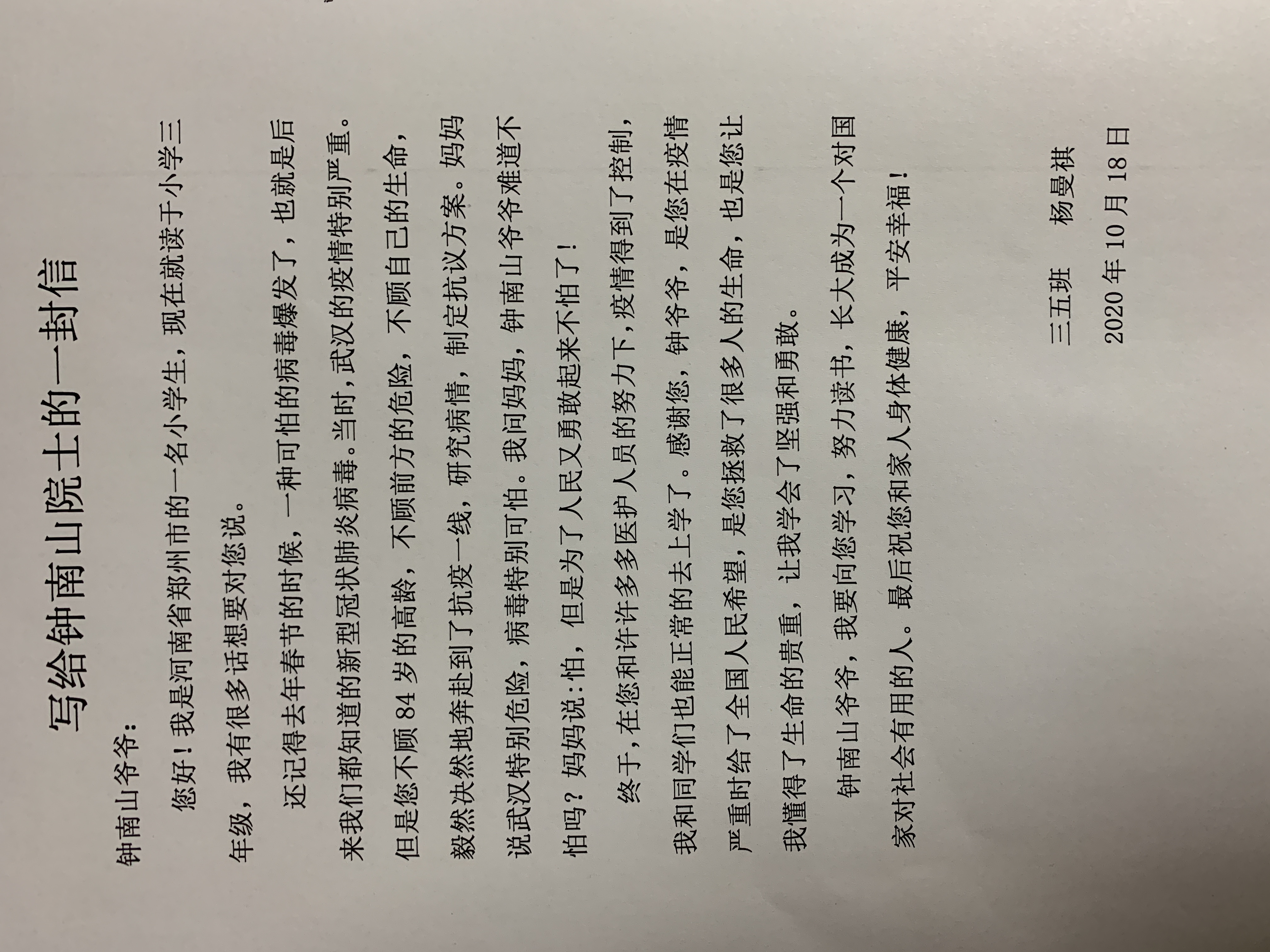 写给钟南山院士的一封信 热685 类别:写人 发表时间:2020-10-18 21:27 已有 686 次阅读 指导老师:李艳莉 所属学校:金水区文化绿城小学