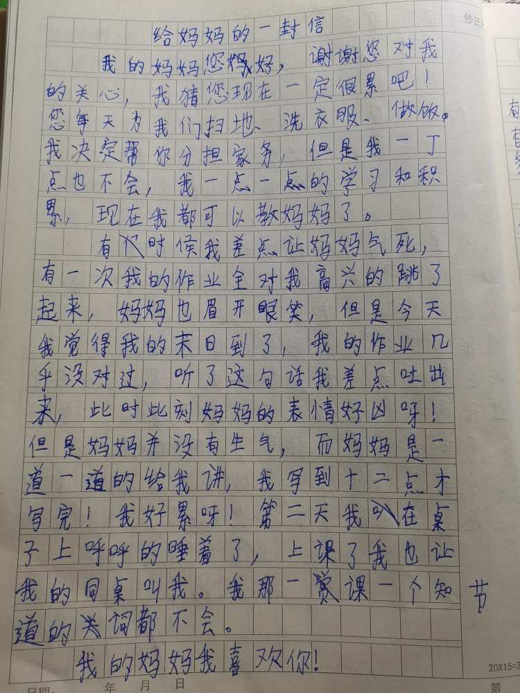给妈妈的一封信 热573 类别:写人 发表时间:2020-10-18 20:23 已有 574 次阅读 指导老师:高璐璐 所属学校:新郑市外国语小学