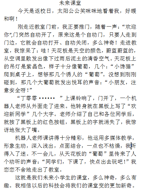 未来课堂 热354 类别:叙事 发表时间:2020-10-20 11:12 已有 355 次阅读 指导老师:李靖 所属学校:新郑市外国语小学