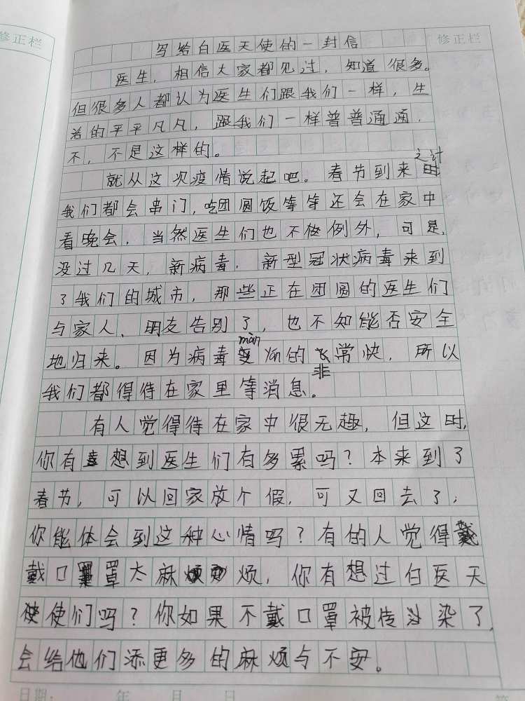 写给白衣天使的一封信 热608 类别:记叙 发表时间:2020-10-21 14:53 已有 609 次阅读 指导老师:牛慧娟 所属学校:新密市东大街小学