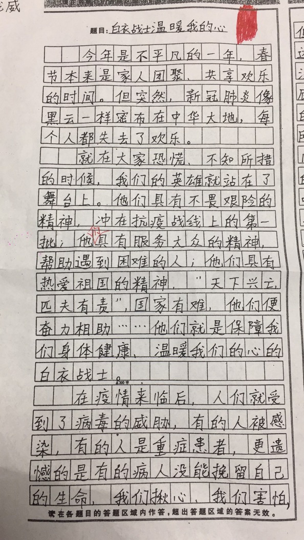 白衣战士温暖了我的心 热247 类别:叙事 发表时间:2020-10-21 22:24 已有 248 次阅读 指导老师:李巧玲 所属学校:新密市市直一初中