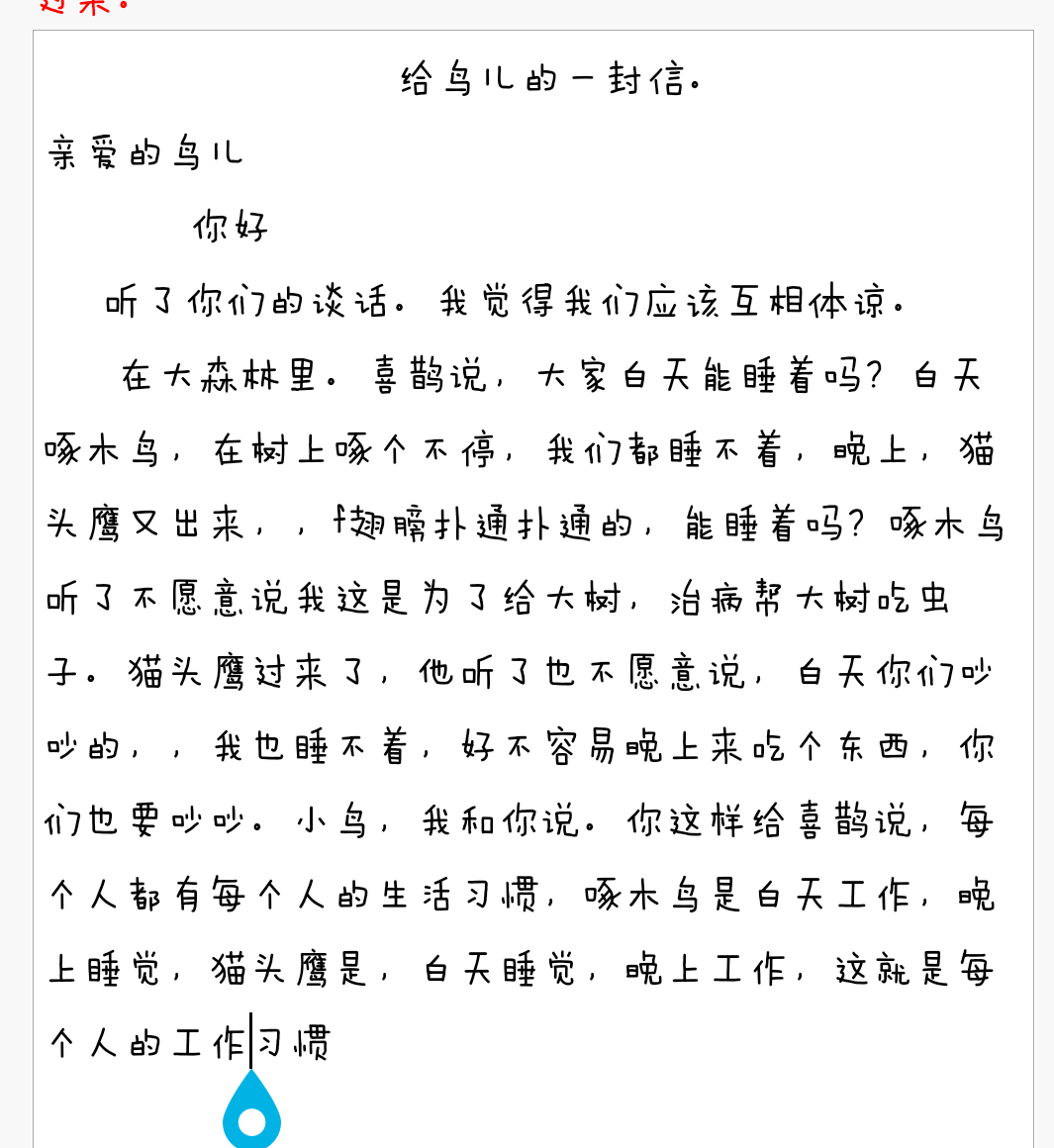 给鸟儿的一封信 热898 类别:其他 发表时间:2020-10-21 23:16 已有 899 次阅读 指导老师:陈梦菲 所属学校:新郑市外国语小学