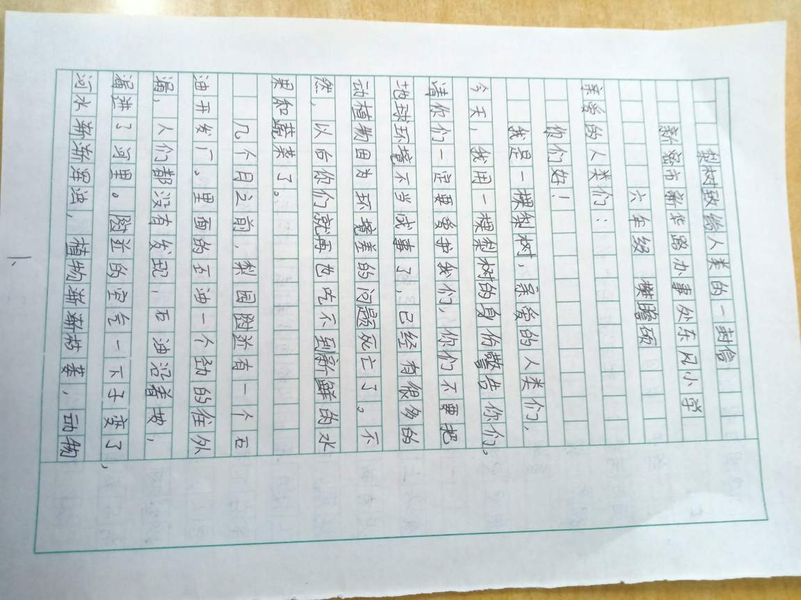 梨树致给人类的一封信 热636 类别:叙事 发表时间:2020-10-28 18:04 已有 637 次阅读 指导老师:王变 所属学校:新密市新华路办事处东风小学