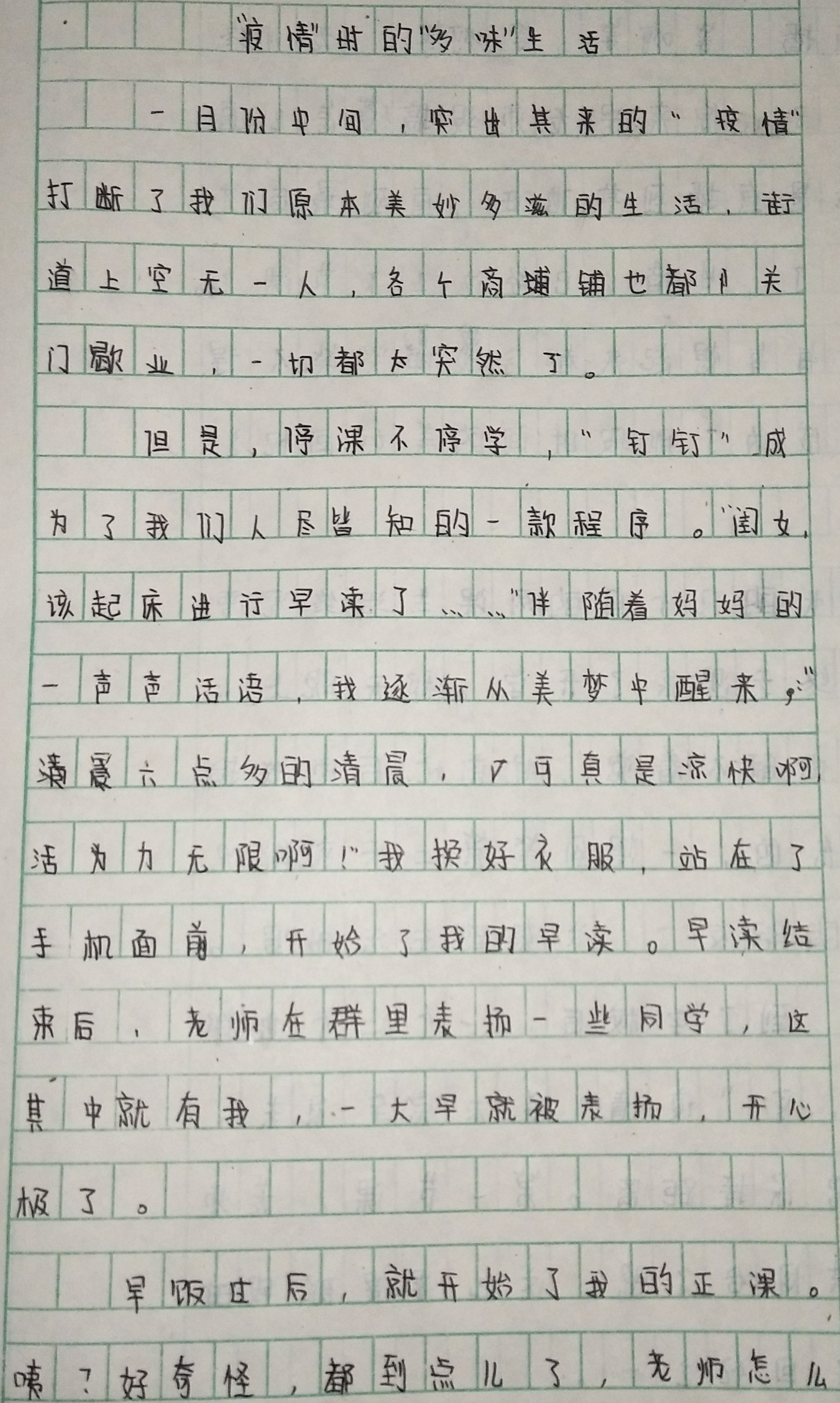 “疫情”时期的“多味”生活 热472 类别:叙事 发表时间:2020-10-25 18:14 已有 473 次阅读 指导老师:韩创新 所属学校:新密市青屏街道办事处初级中学