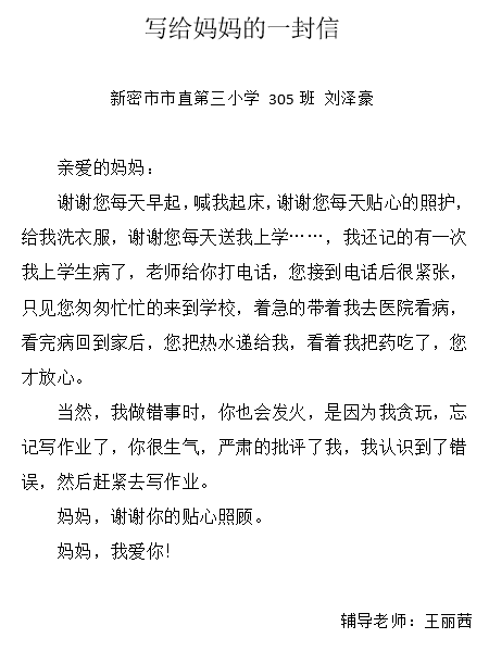 写给妈妈的一封信 热274 类别:叙事 发表时间:2020-10-26 20:47 已有 275 次阅读 指导老师:王丽茜 所属学校:新密市市直第三小学