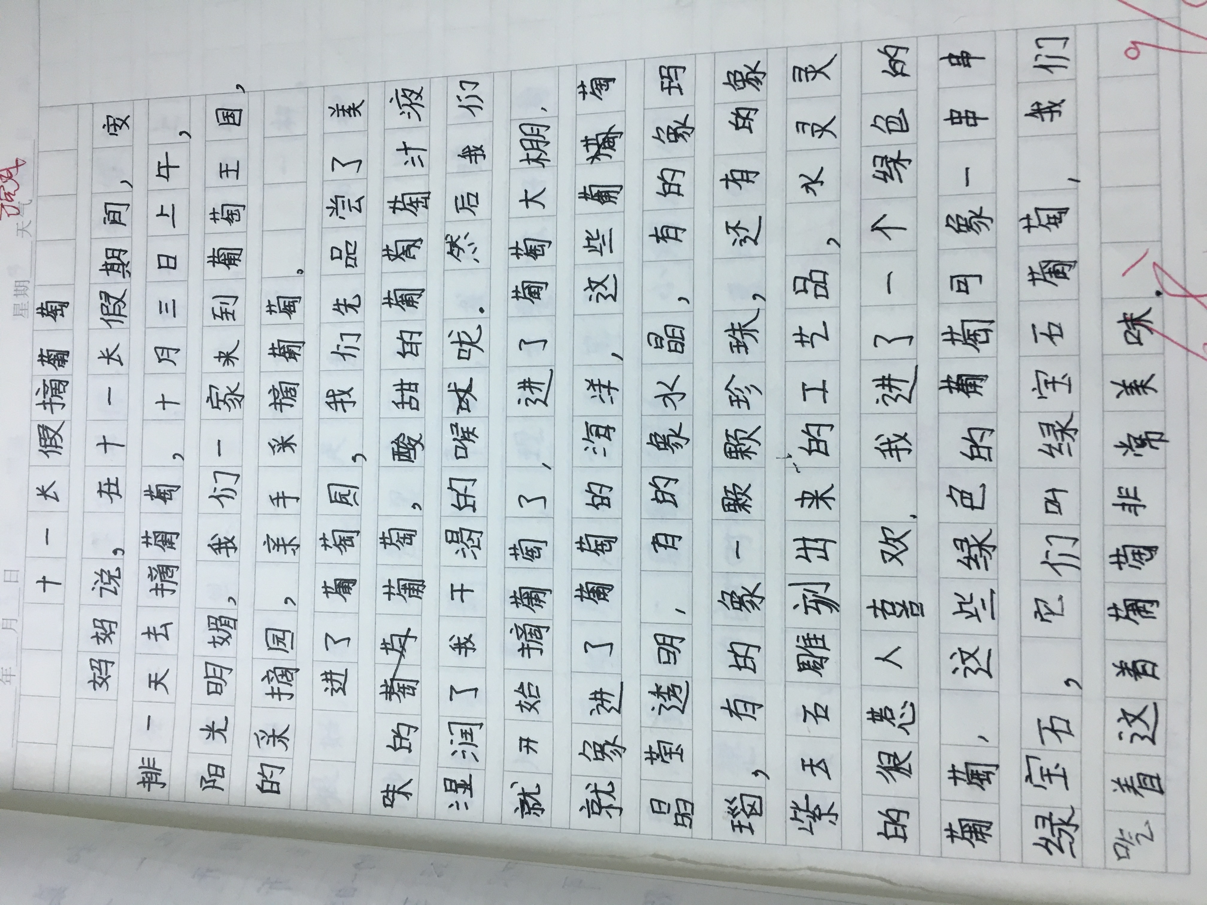 十一长假摘葡萄 热652 类别:绘景 发表时间:2020-10-28 18:15 已有 653 次阅读 指导老师:郑会芳 所属学校:新密市东大街小学