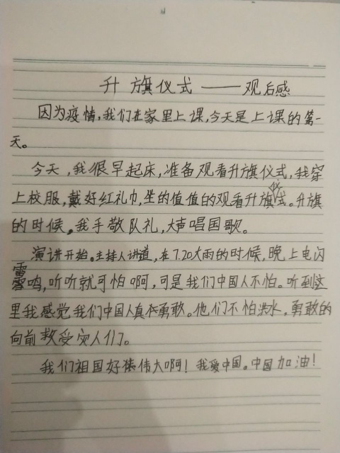 升旗仪式观后感 热291 类别:其他 发表时间:2021-09-01 17:30 已有 292 次阅读 指导老师:赵卫利 所属学校:中牟县官渡路小学