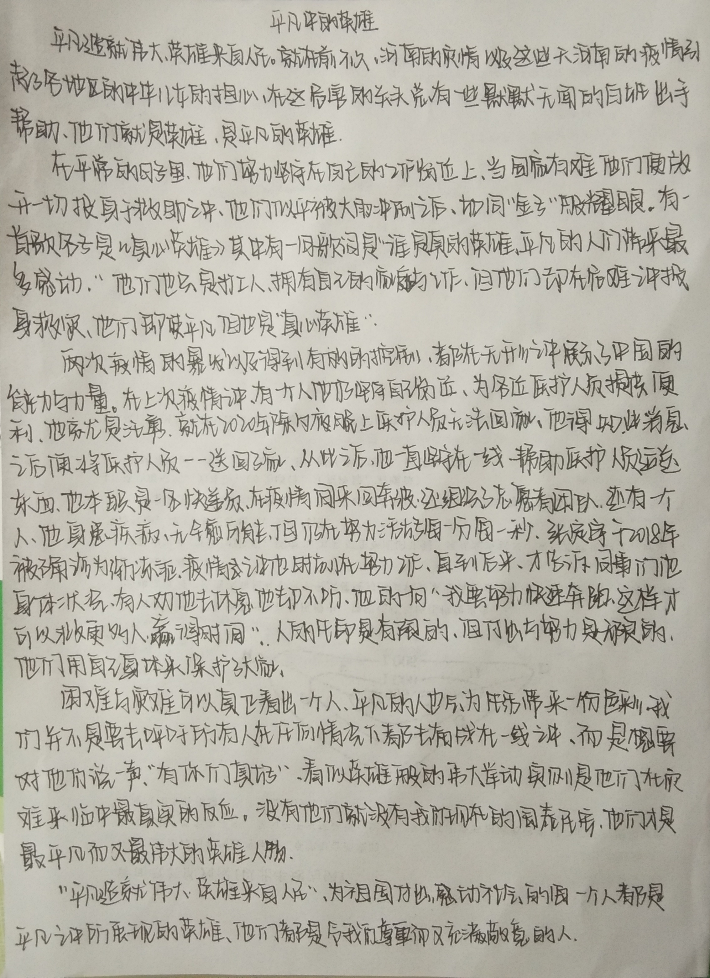 平凡中的英雄 热218 类别:写人 发表时间:2021-09-06 15:44 已有 219 次阅读 指导老师:李梦 所属学校:新郑市实验高级中学