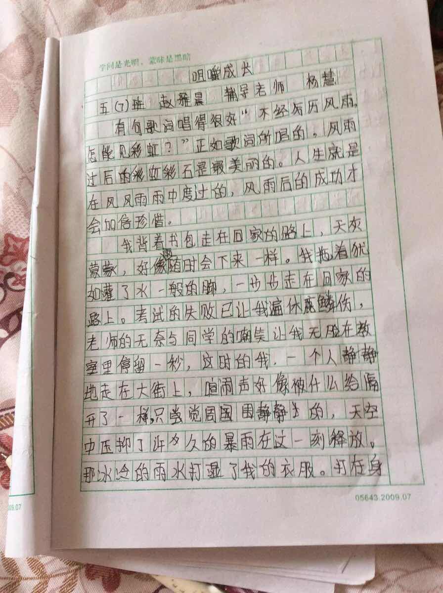 版权说明: A类权限 我谨保证我是此作品的著作权人,并且此作品系首发于郑州教育信息网作文博览频道。我同意郑州教育信息网作文博览频道作为此作品版权的独占代理人。在撤销本委托之前,我不再将此作品投给其他媒体,有关此作品发表和转载等任何事宜,由郑州教育信息网作文博览频道全权负责。未经郑州教育信息网作文博览频道转授权,其他媒体一律不得转载。 |