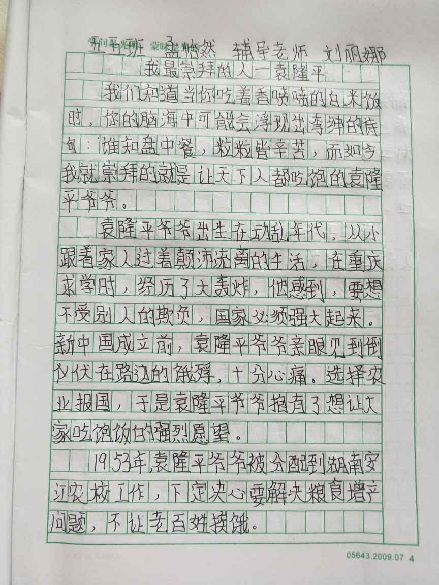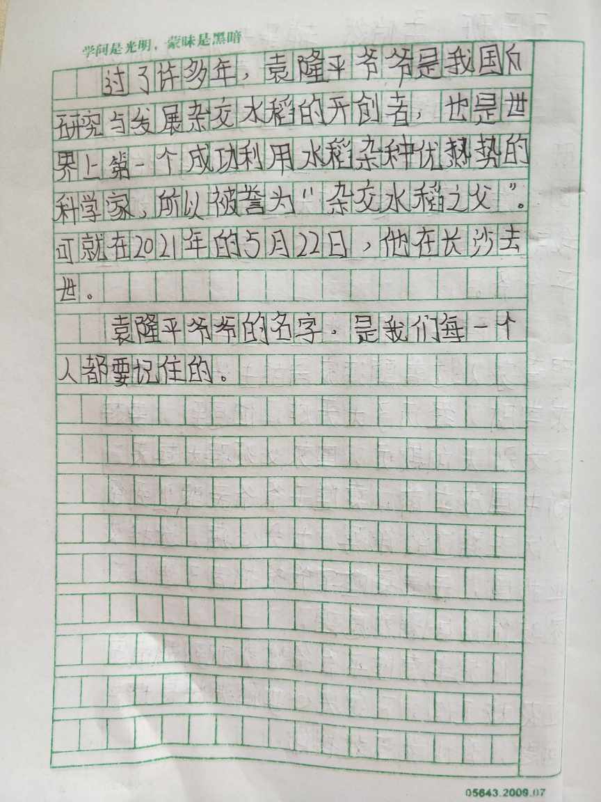 我最崇拜的人--袁隆平 热355 类别:写人 发表时间:2021-09-14 15:33 已有 356 次阅读 指导老师:刘丽娜 所属学校:中牟县平安路学校