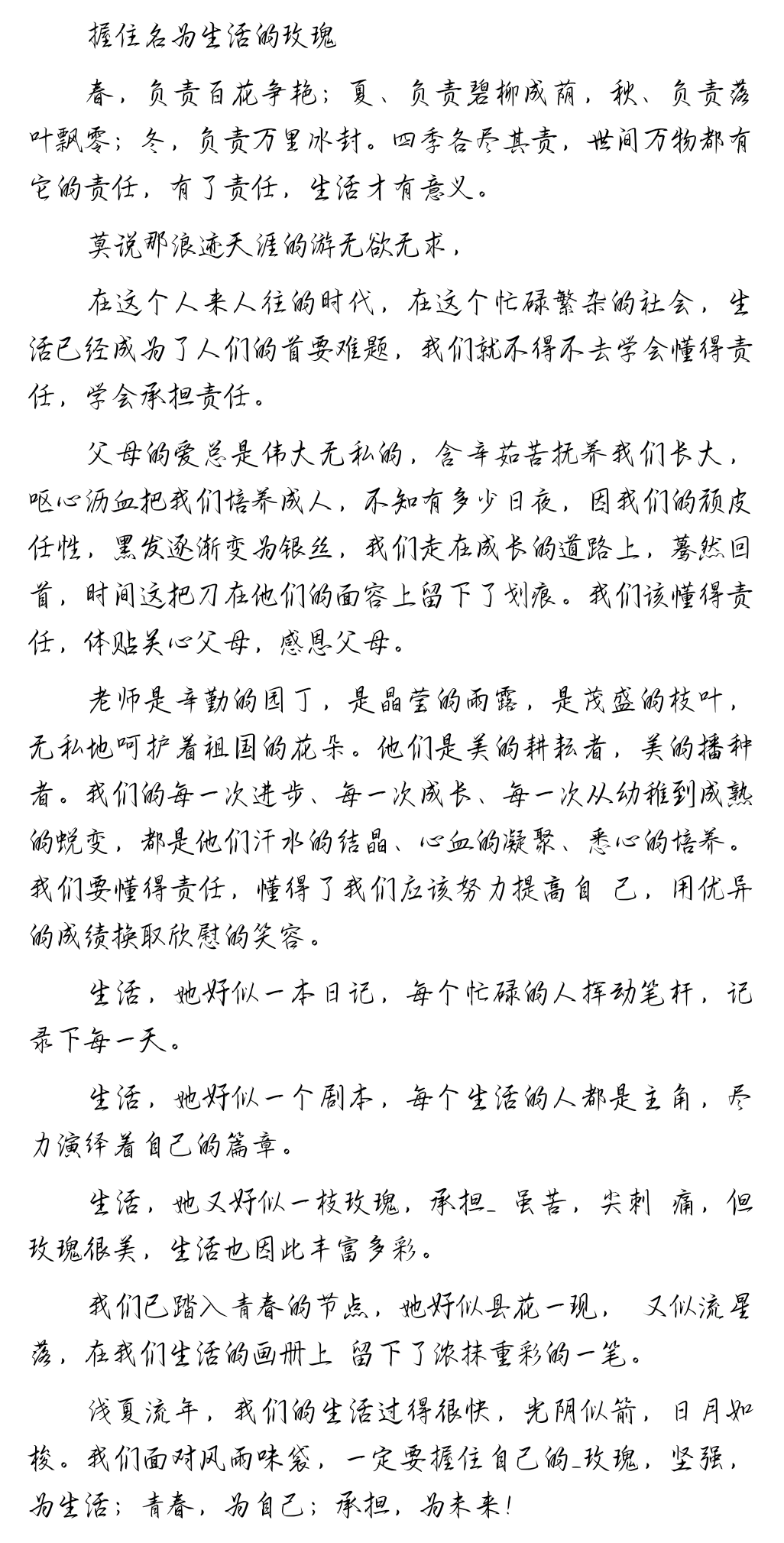握住名为生活的玫瑰 热420 类别:原创 发表时间:2021-09-12 16:26 已有 421 次阅读 指导老师:胡彦花 所属学校:中牟县刁家乡中心中学