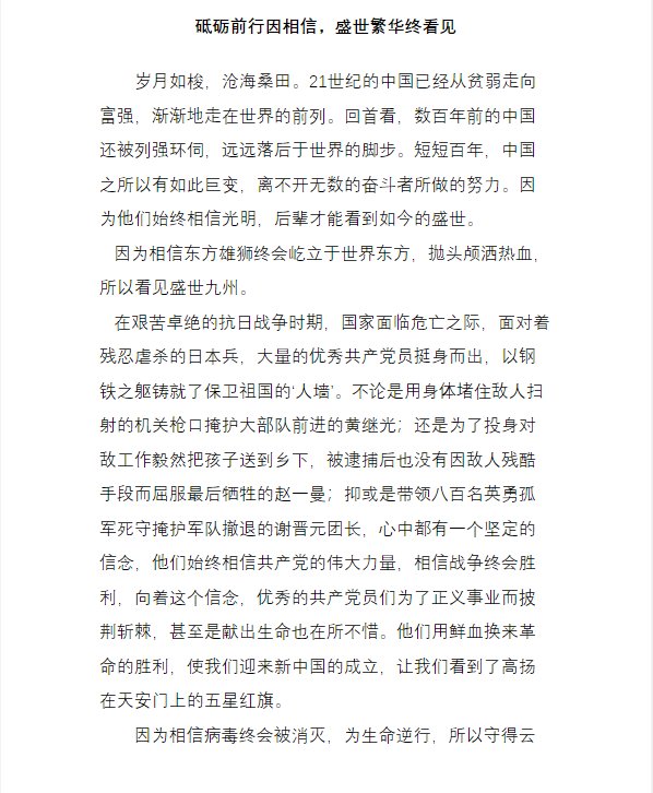 砥砺前行因相信,盛世繁华终看见 热939 类别:议论 发表时间:2021-09-05 18:55 已有 940 次阅读 指导老师:丁莉阳 所属学校:河南省新郑市第一中学