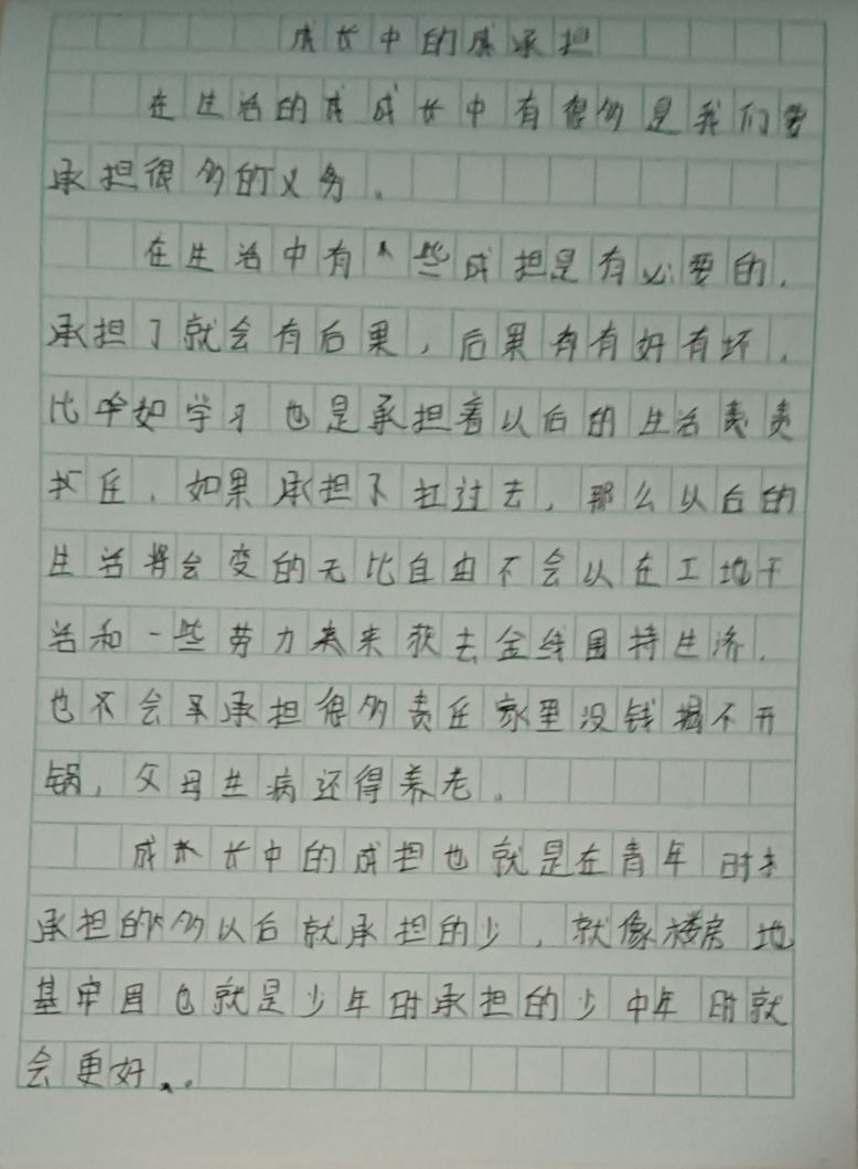 成长中的承担 热341 类别:其他 发表时间:2021-09-12 20:56 已有 342 次阅读 指导老师:褚梦晨 所属学校:中牟县大孟镇中心中学