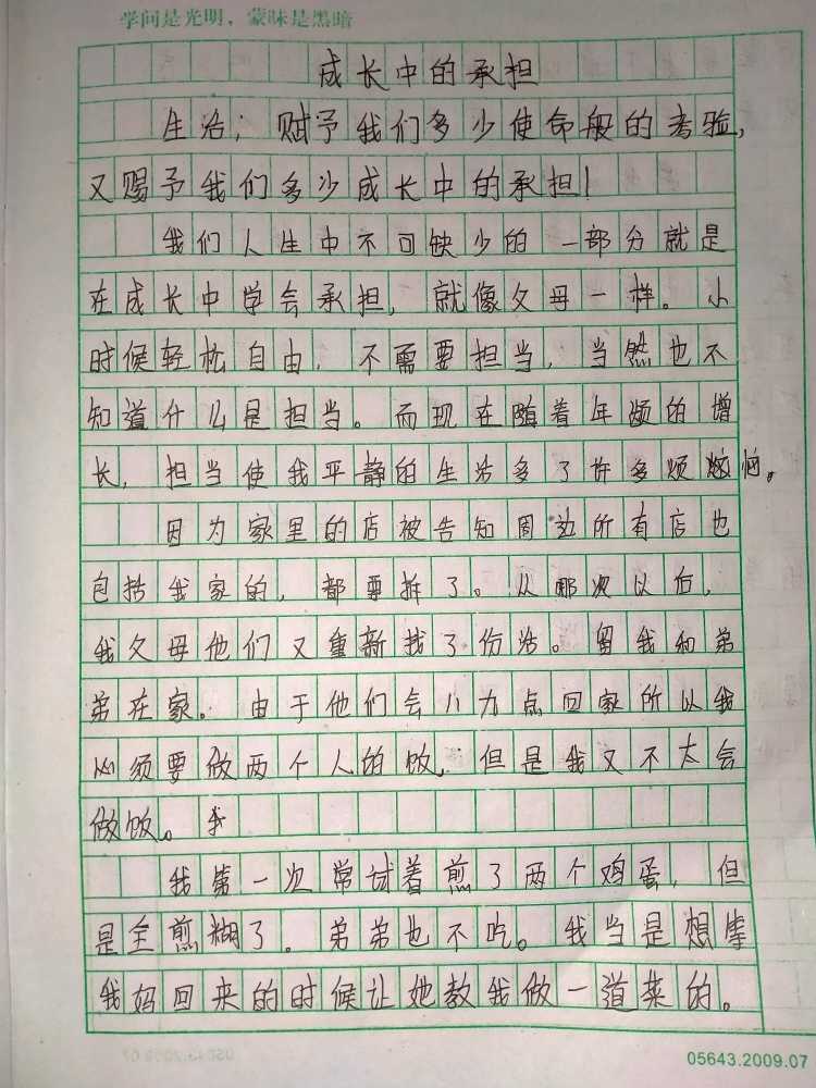 成长中的承担 热181 类别:叙事 发表时间:2021-09-12 17:28 已有 182 次阅读 指导老师:杜田田 所属学校:中牟县平安路学校