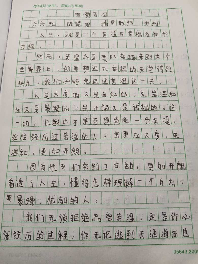 咀嚼苦涩 热404 类别:记叙 发表时间:2021-09-15 16:33 已有 405 次阅读 指导老师:刘珂 所属学校:中牟县平安路学校