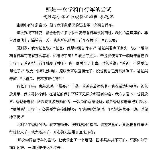 那是一次学骑自行车的尝试 热679 类别:叙事 发表时间:2021-07-29 21:51 已有 680 次阅读 指导老师:王欢 所属学校:金水区丰收小学