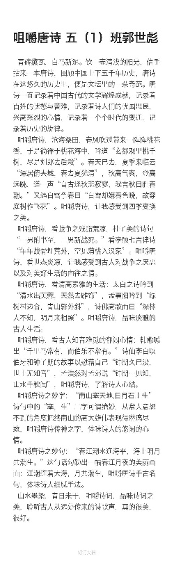 (5) 咀嚼唐诗,看清高素雅的生活:太白之诗吟到“清水出芙蓉,天然去雕饰”,孟襄阳吟到“绿树村边合,青山郭外斜”,诗佛高歌而曰“深林人不知,明月来相照”。咀嚼唐诗,品味淡雅的古人生活。