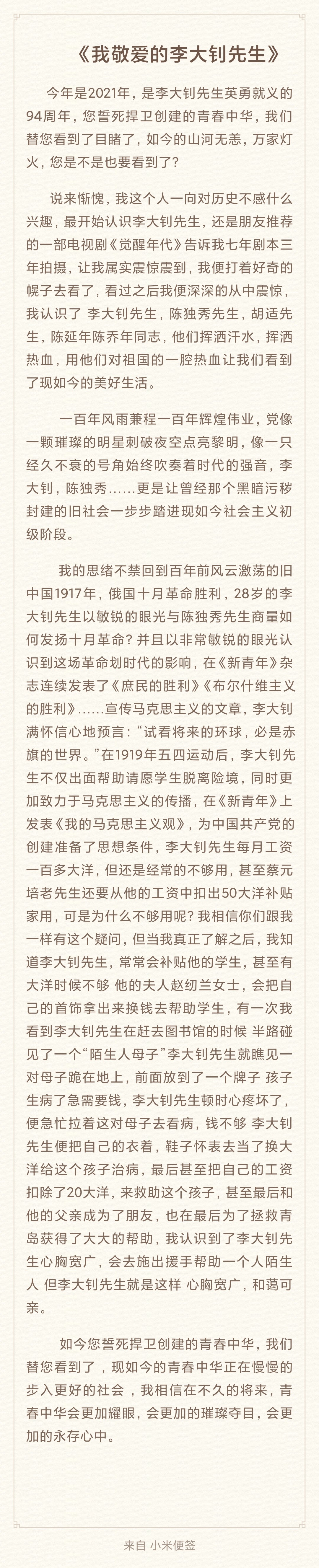 《我敬爱的李大钊先生》 热322 类别:写人 发表时间:2021-08-28 16:56 已有 323 次阅读 指导老师:张亚星 所属学校:郑州航空港区白庄小学