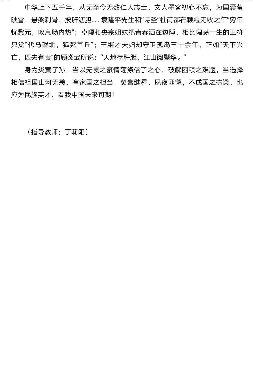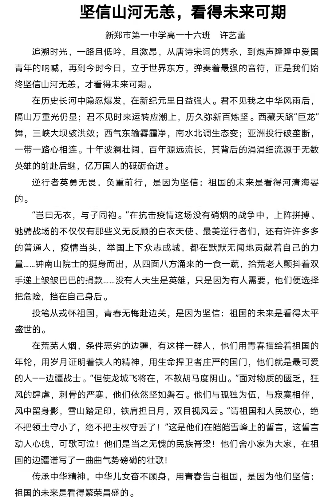 坚信山河无恙,看得未来可期 热269 类别:议论 发表时间:2021-09-05 16:33 已有 270 次阅读 指导老师:丁莉阳 所属学校:河南省新郑市第一中学