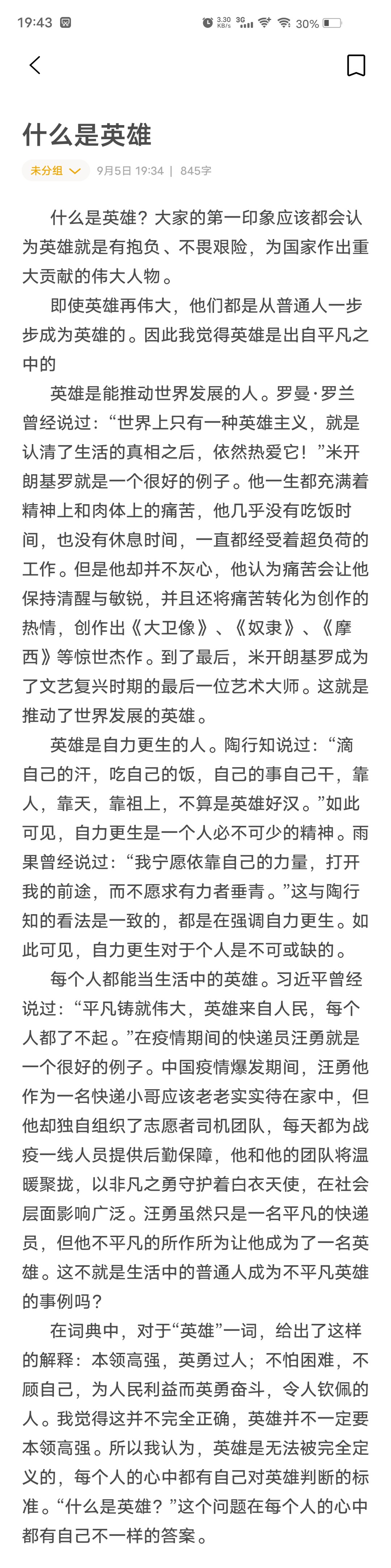 什么是英雄 热293 类别:议论 发表时间:2021-09-05 19:44 已有 294 次阅读 指导老师:丁莉阳 所属学校:河南省新郑市第一中学