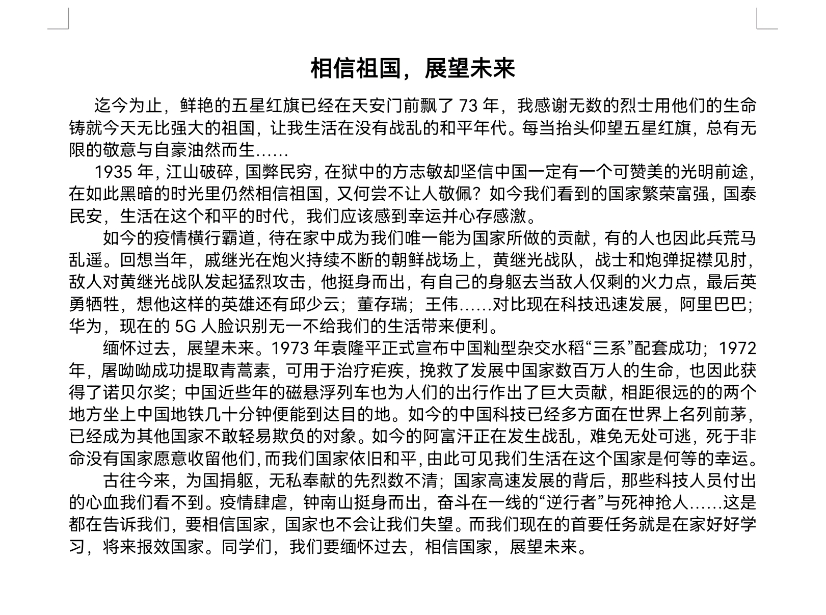 相信祖国,展望未来 热609 类别:议论 发表时间:2021-09-05 21:11 已有 610 次阅读 指导老师:丁莉阳 所属学校:河南省新郑市第一中学