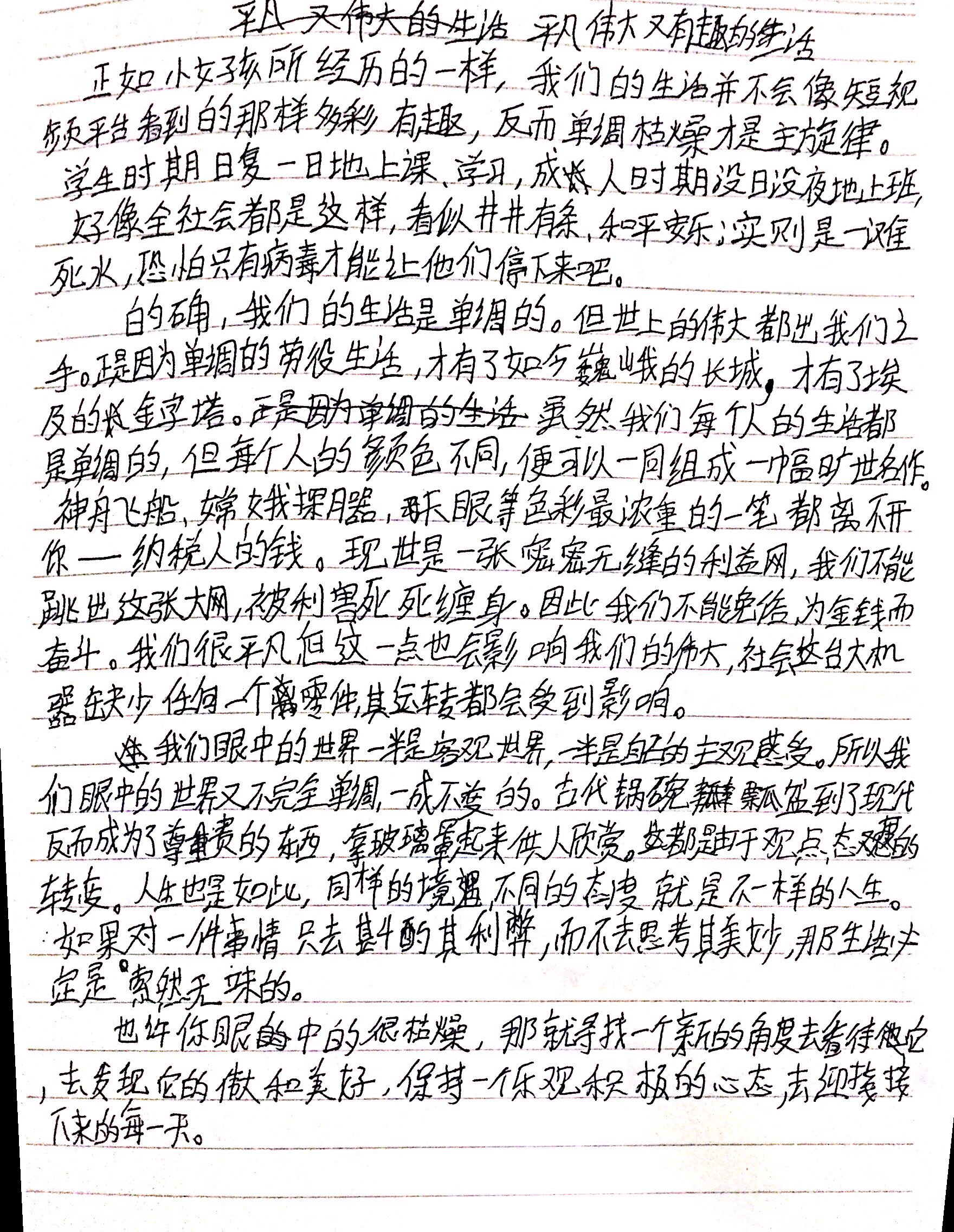平凡伟大又有趣的生活 热447 类别:抒情 发表时间:2021-09-07 18:22 已有 448 次阅读 指导老师:陈昭凌 所属学校:河南省新郑市第一中学