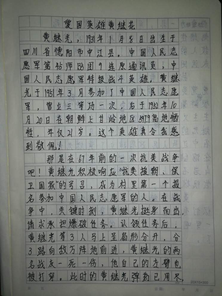 爱国英雄黄继光 热510 类别:写人 发表时间:2021-09-09 20:06 已有 511 次阅读 指导老师:付亚萍 所属学校:中牟县大孟镇芦岗小学
