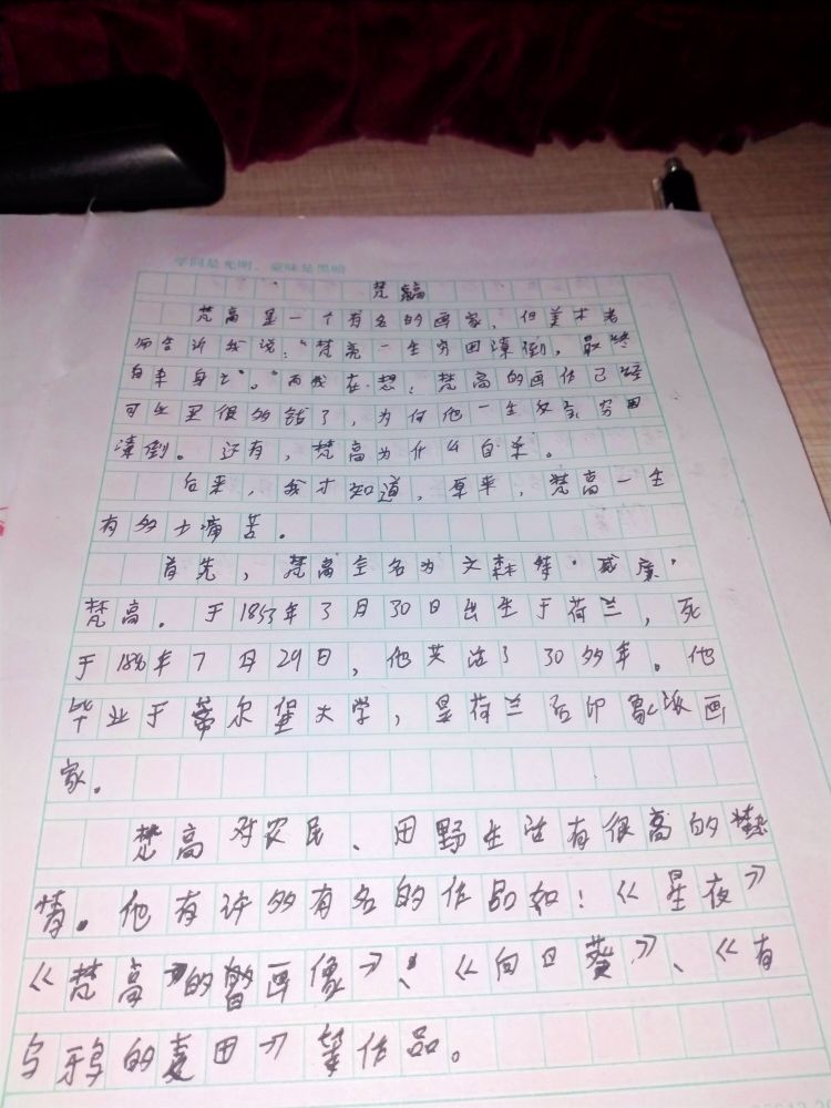 梵高 热374 类别:写人 发表时间:2021-09-10 18:48 已有 375 次阅读 指导老师:王慧 所属学校:中牟县第七初级中学