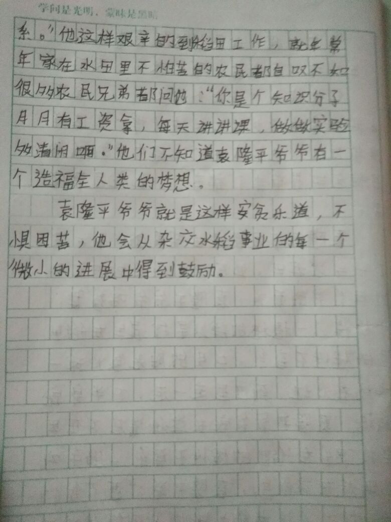 百年历程我最崇拜袁隆平 热510 类别:写人 发表时间:2021-09-09 18:25 已有 511 次阅读 指导老师:刘丽娜 所属学校:中牟县平安路学校