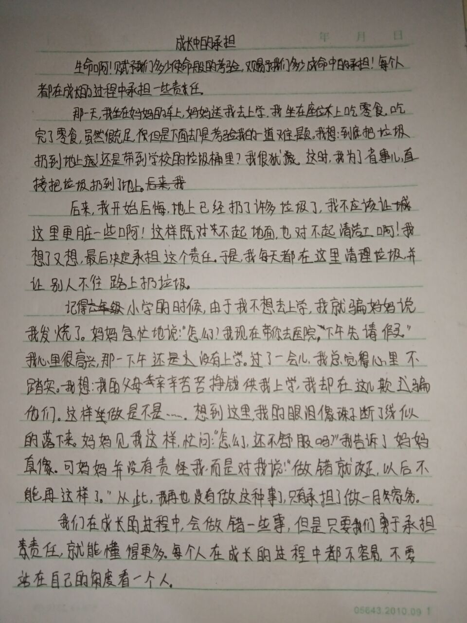 成长中的承担 热191 类别:叙事 发表时间:2021-09-13 20:28 已有 192 次阅读 指导老师:赵茹 所属学校:中牟县紫薇路中学