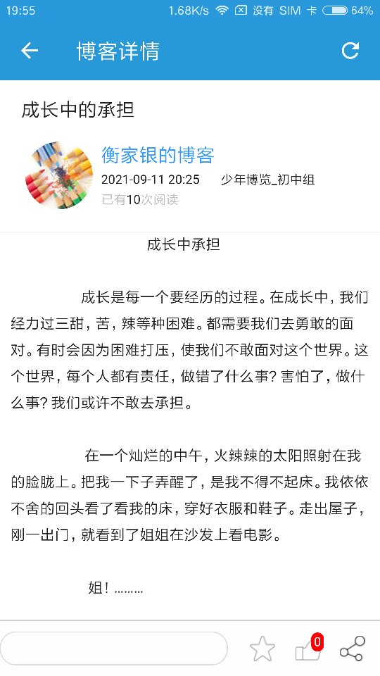 成长中承担 热792 类别:叙事 发表时间:2021-09-14 20:07 已有 793 次阅读 指导老师:吕颖颖 所属学校:中牟县紫薇路中学