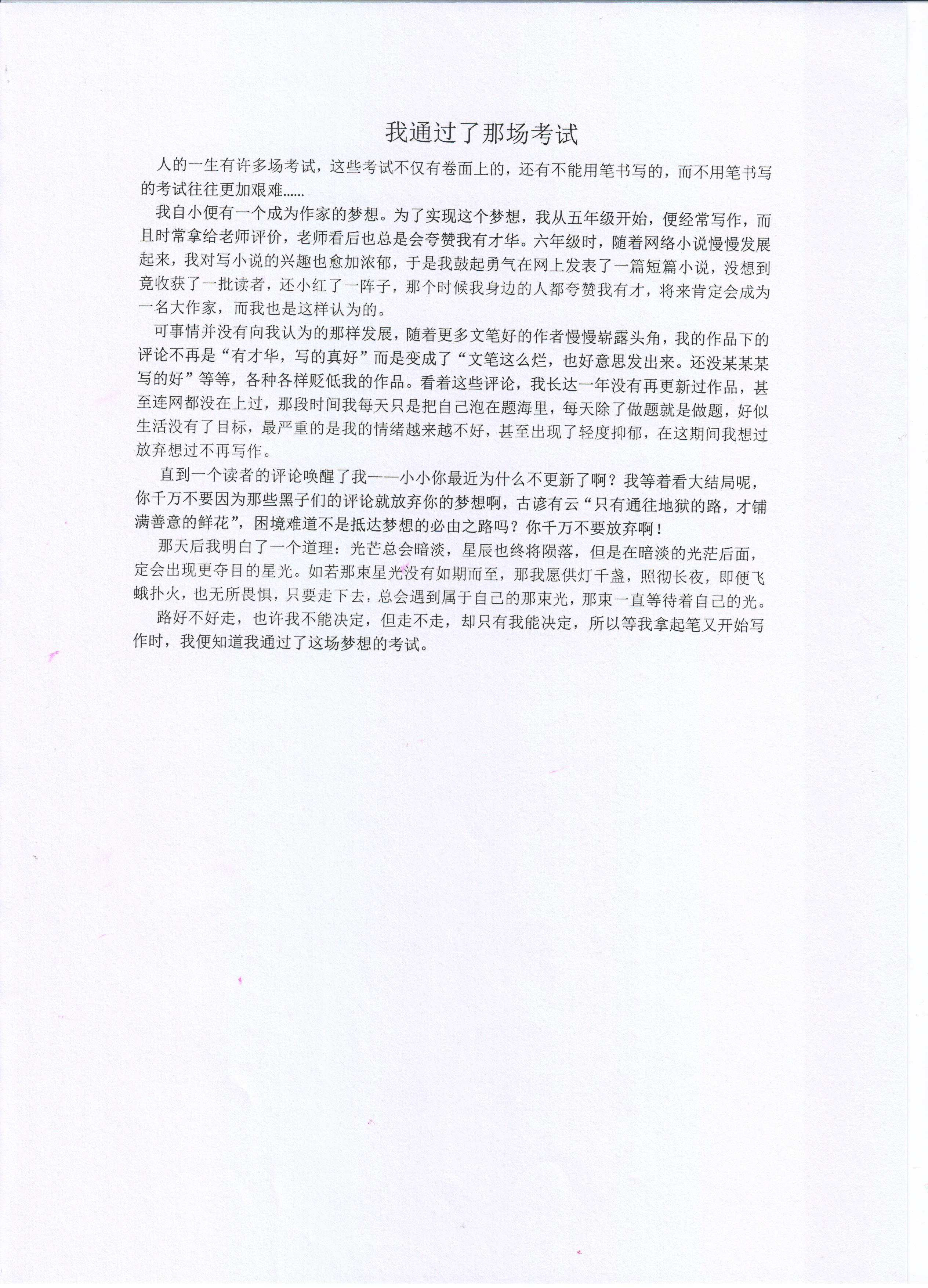 我通过了那场考试 热315 类别:记叙 发表时间:2021-09-12 17:54 已有 316 次阅读 指导老师:原淑婷 所属学校:中牟县紫薇路中学