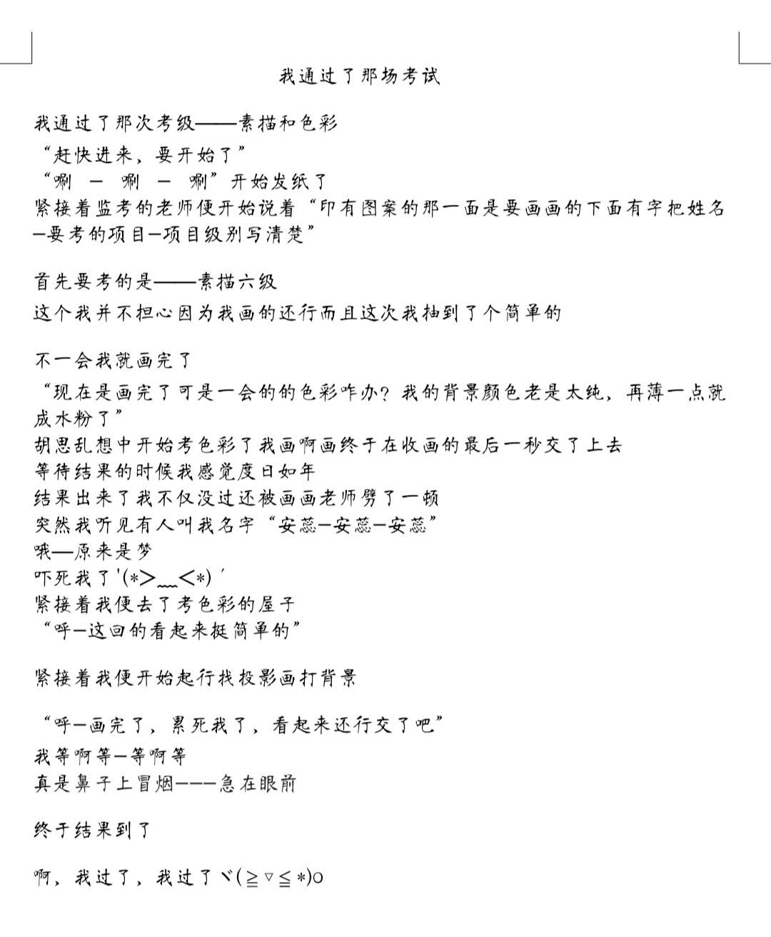 我通过了那场考试 热263 类别:记叙 发表时间:2021-09-12 18:36 已有 264 次阅读 指导老师:刘卓琳 所属学校:河南省实验文博学校