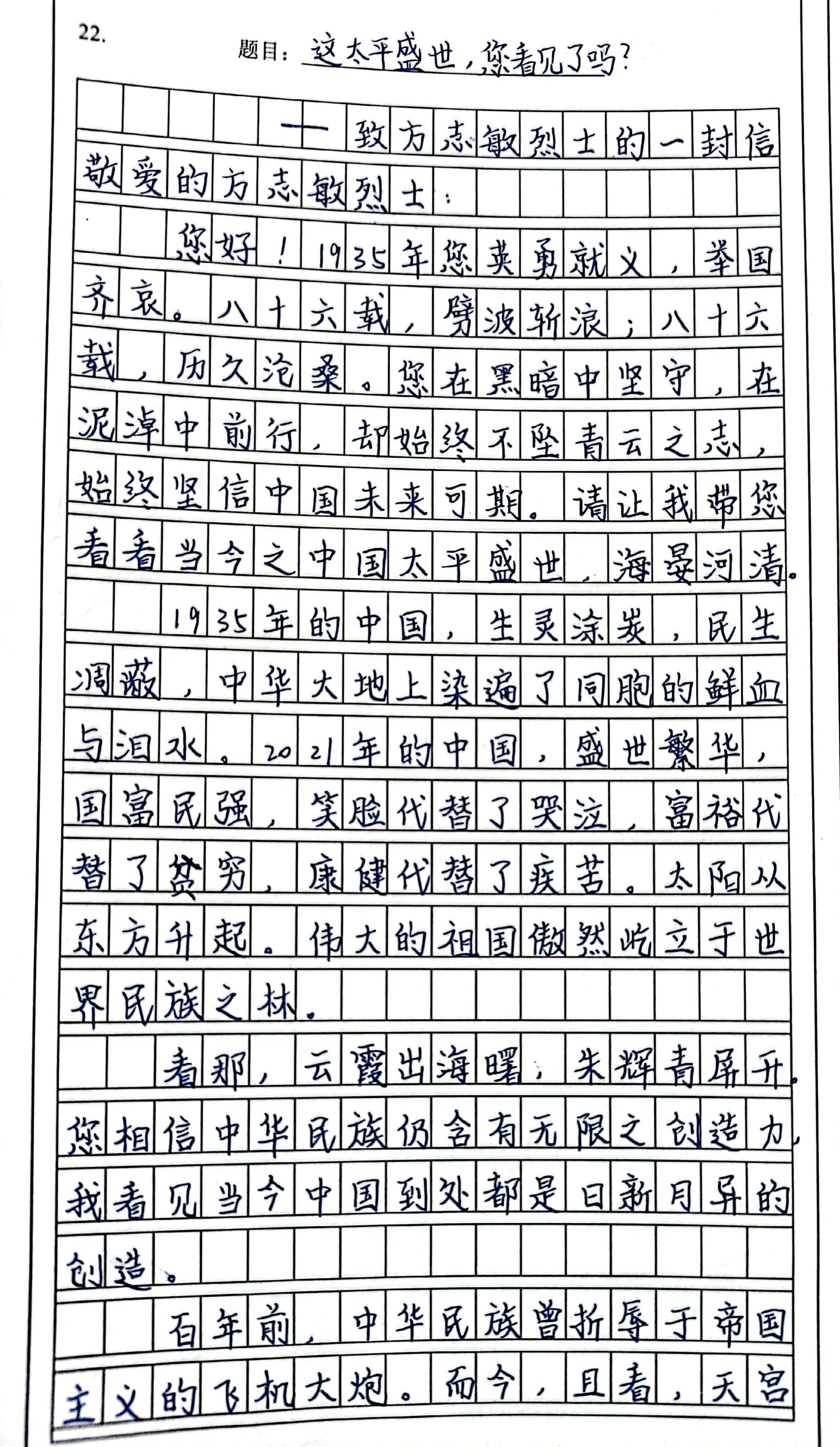 这太平盛世,您看见了吗? 热794 类别:议论 发表时间:2021-09-12 10:53 已有 795 次阅读 指导老师:贾颖 所属学校:郑州市第十一中学