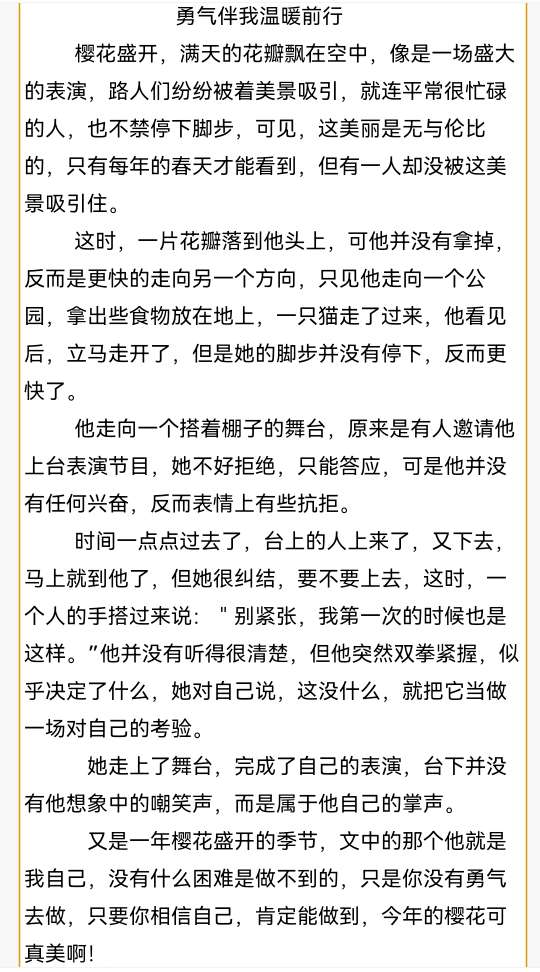 勇气伴我温暖前行 热472 类别:叙事 发表时间:2021-09-14 13:29 已有 473 次阅读 指导老师:武丹阳 所属学校:中牟县紫薇路中学