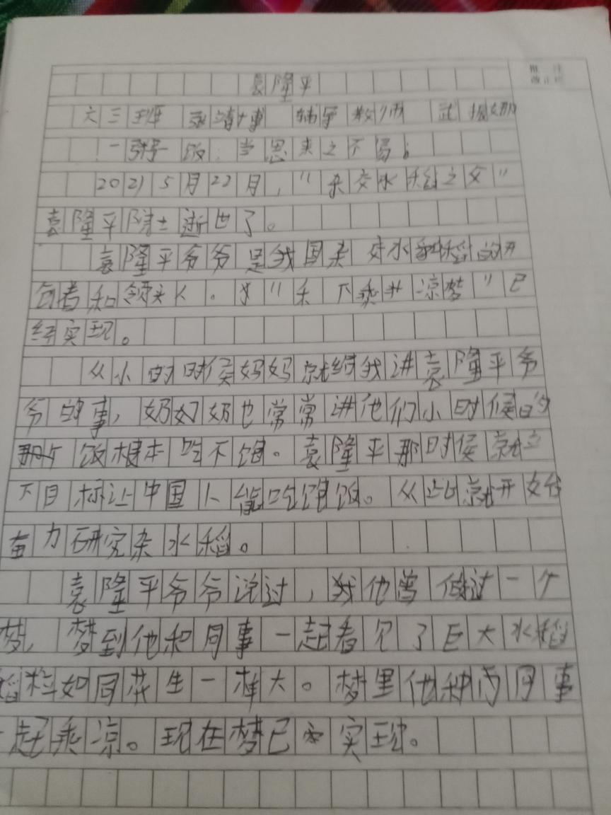 袁隆平 热1187 类别:写人 发表时间:2021-09-12 11:04 已有 1188 次阅读 指导老师:武振娜 所属学校:中牟县平安路学校