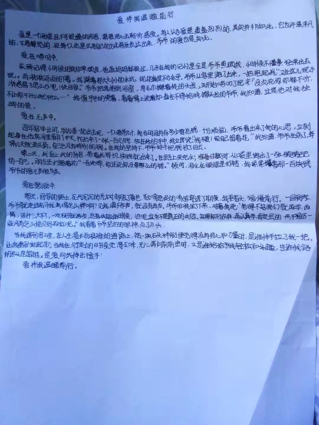 爱伴我温暖远行 热522 类别:叙事 发表时间:2021-09-12 14:00 已有 523 次阅读 指导老师:白雪丽 所属学校:新郑市实验中学