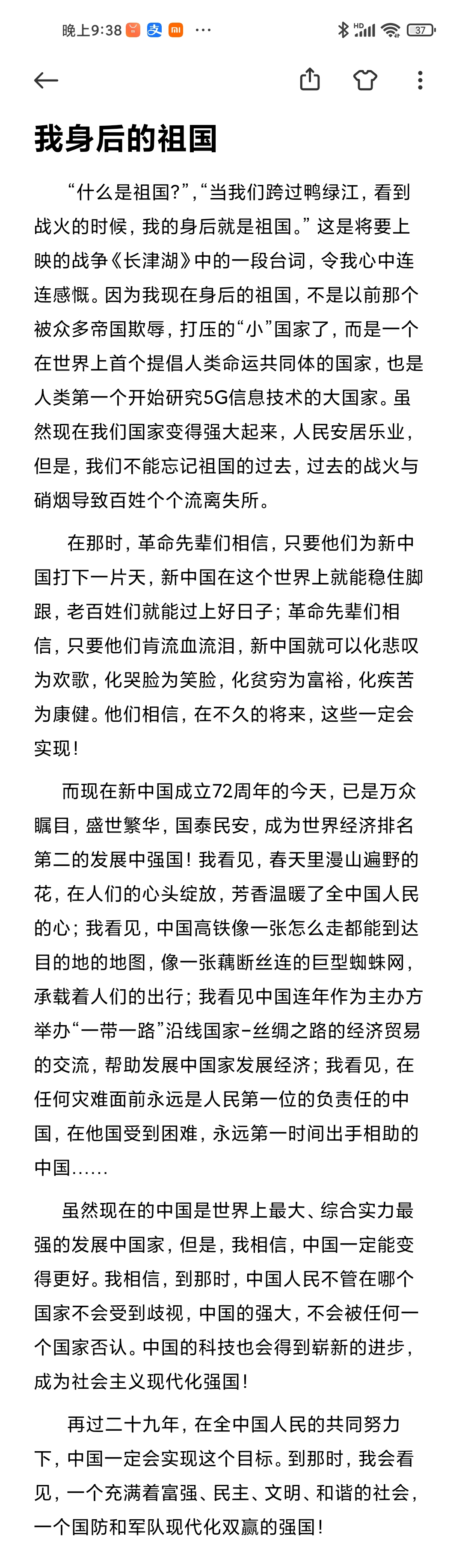 我身后的祖国 热659 类别:记叙 发表时间:2021-09-12 21:39 已有 660 次阅读 指导老师:孙庄丽 所属学校:郑州市二七区第74中学