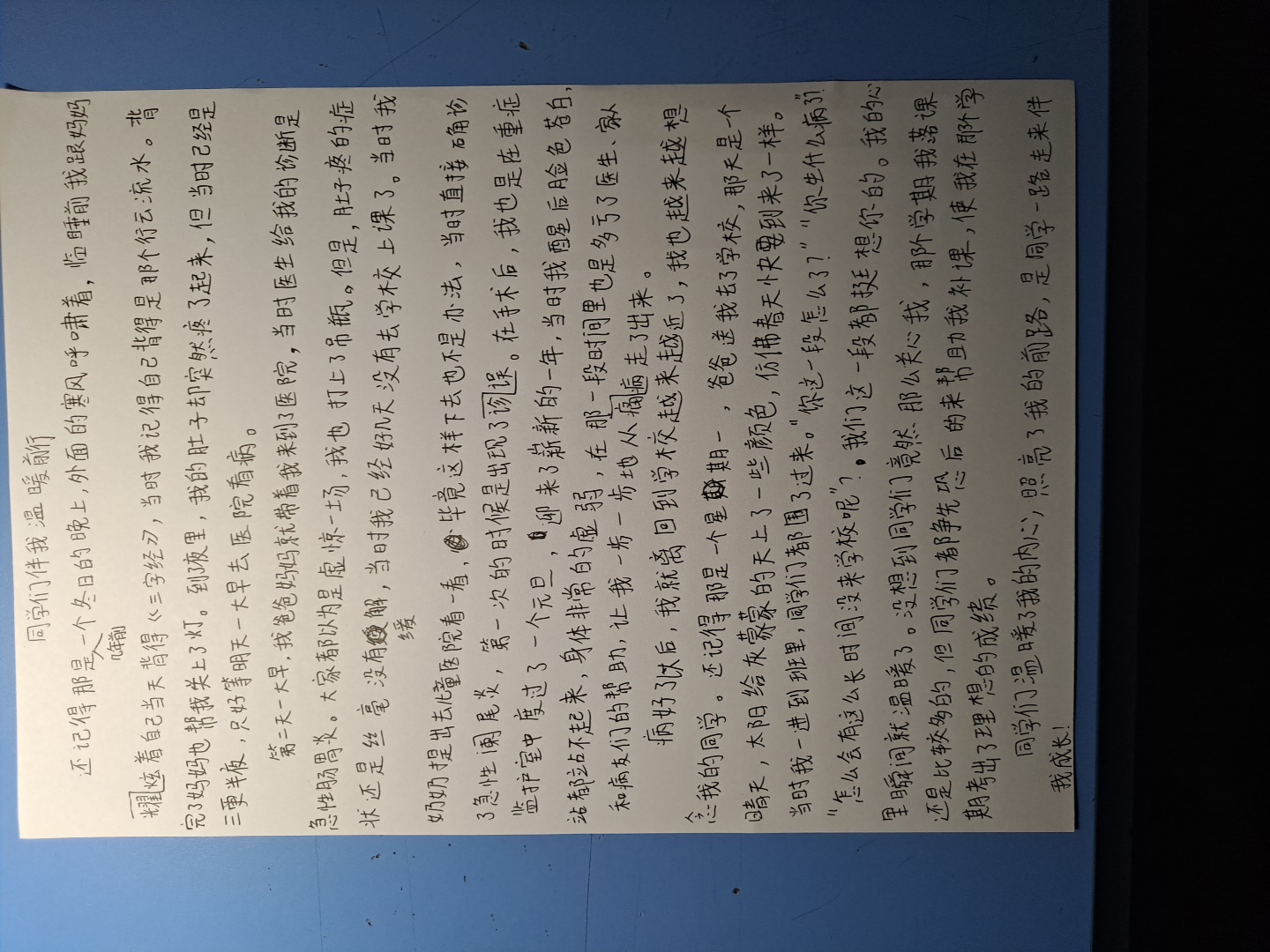同学们伴我温暖前行 热315 类别:叙事 发表时间:2021-09-13 00:47 已有 316 次阅读 指导老师:刘卓琳 所属学校:河南省实验文博学校