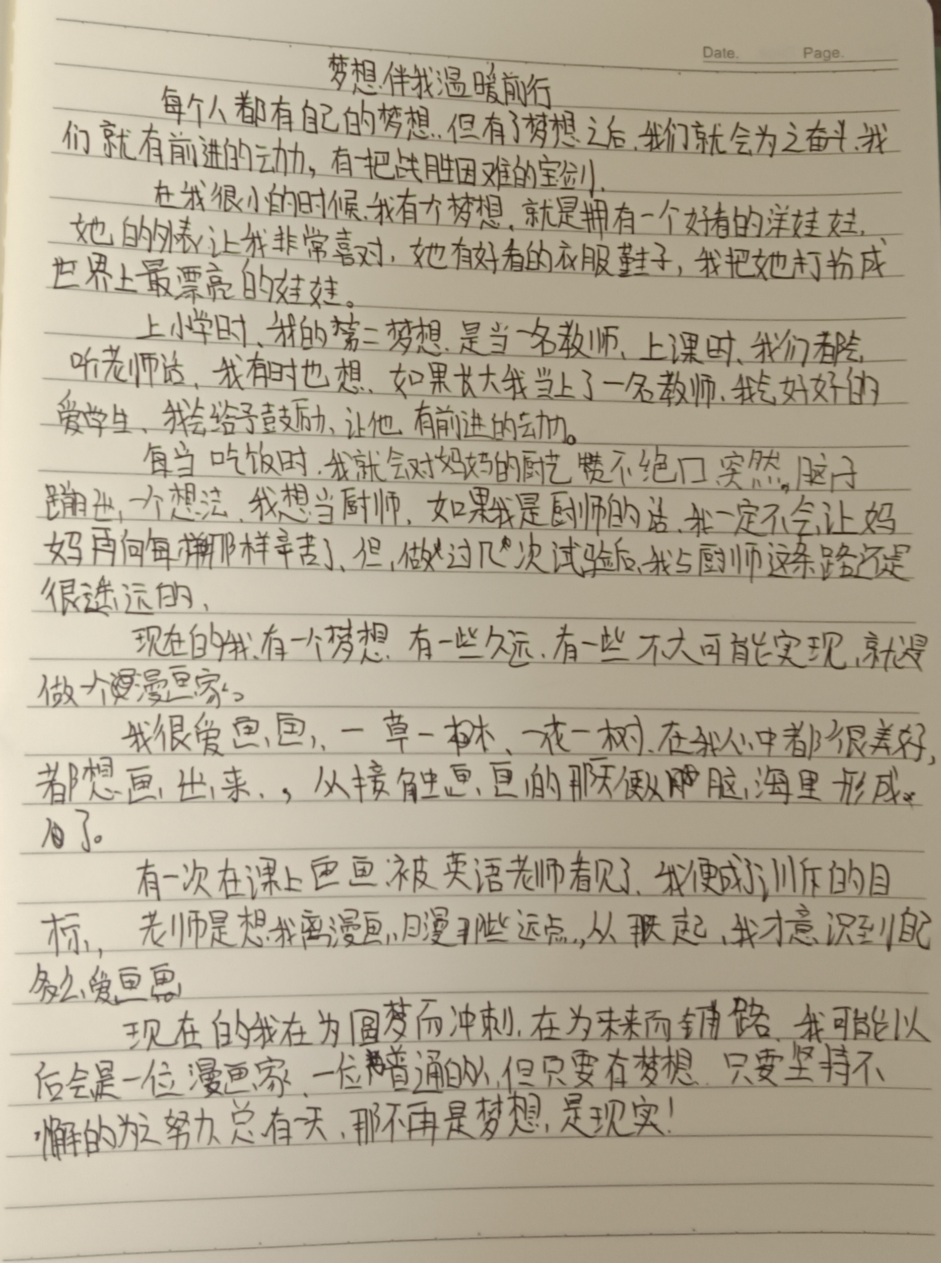梦想伴我温暖前行 热593 类别:其他 发表时间:2021-09-14 12:50 已有 594 次阅读 指导老师:段春莲 所属学校:中牟县紫薇路中学