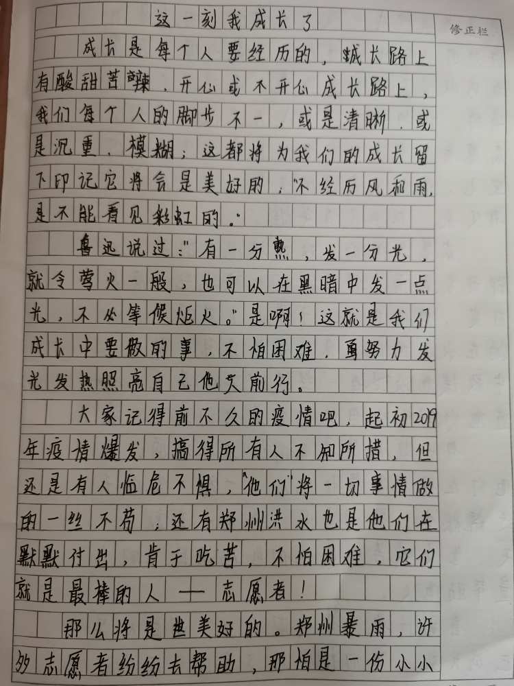 这一刻我成长了 热152 类别:其他 发表时间:2021-09-14 09:52 已有 153 次阅读 指导老师:路月霞 所属学校:中牟县紫薇路中学