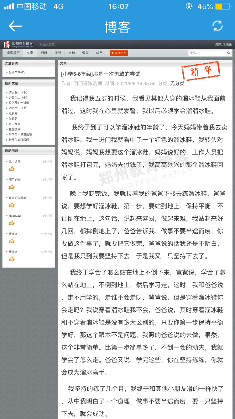 那是一次勇敢的尝试 热450 类别:原创 发表时间:2021-09-14 13:56 已有 451 次阅读 指导老师:孙瑞萍 所属学校:中牟县官渡路小学