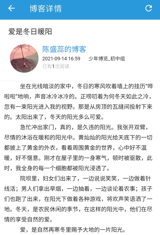爱是冬日暖阳 热517 类别:抒情 发表时间:2021-09-14 17:25 已有 518 次阅读 指导老师:陈盛蕊 所属学校:中牟县第七初级中学