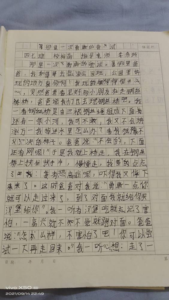 那是一次勇敢的尝试 热1011 类别:叙事 发表时间:2021-09-14 23:00 已有 1012 次阅读 指导老师:李伟玲 所属学校:中牟县大孟镇中心小学