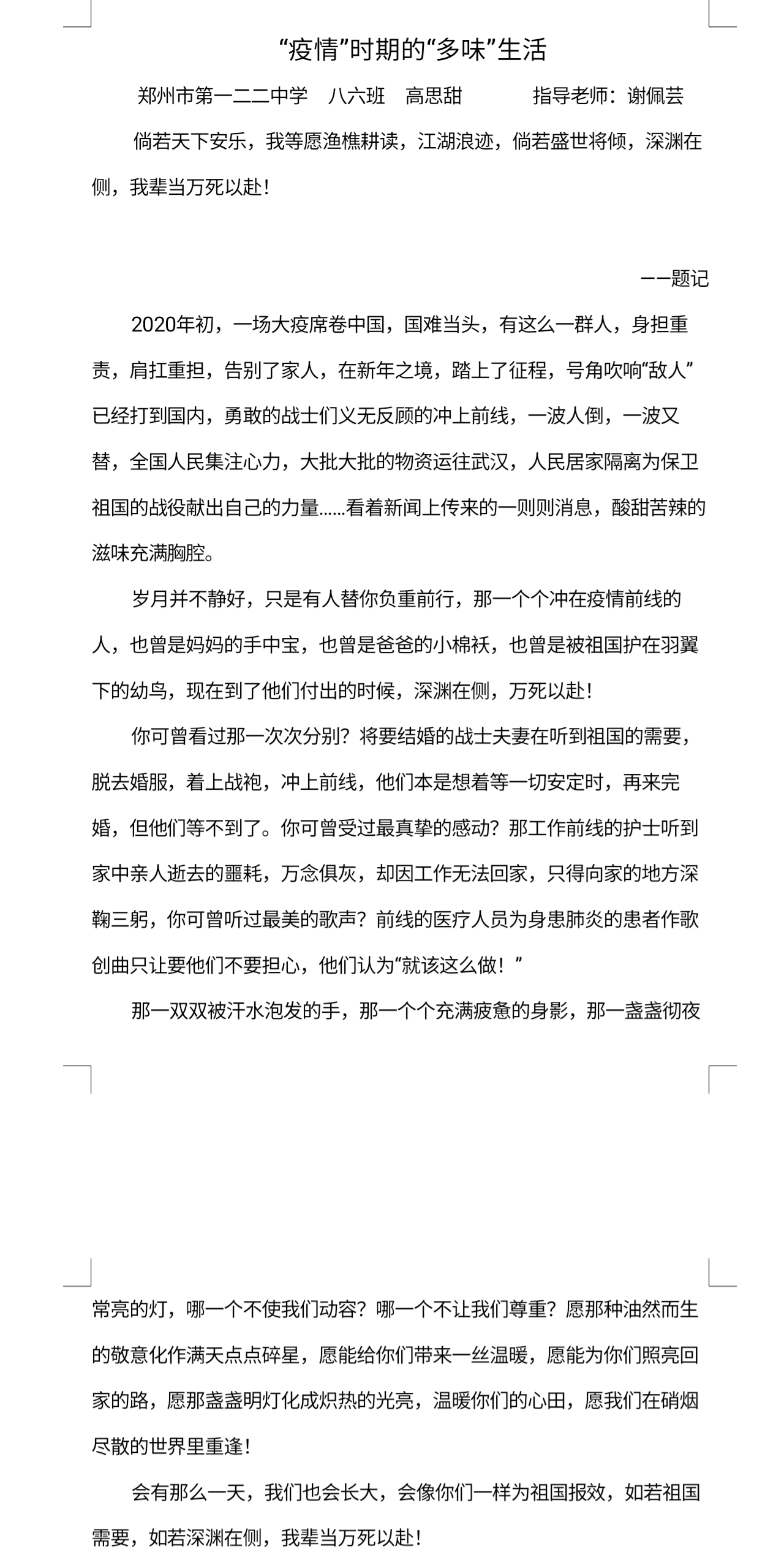 “疫情”时期的“多味”生活 热944 类别:记叙 发表时间:2020-06-04 09:24 已有 944 次阅读 指导老师:谢佩芸 所属学校:郑州市航空港区一二二中学